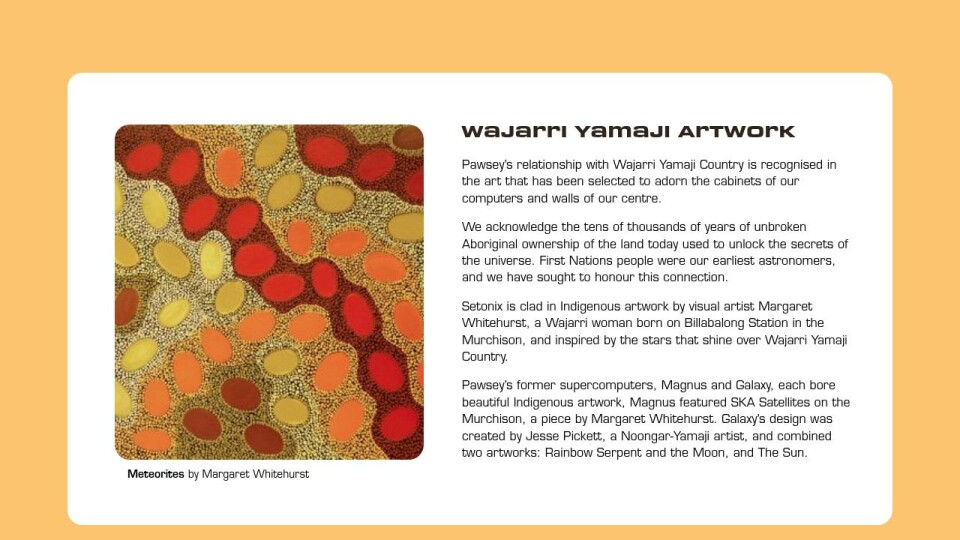 Pawsey’s relationship with Wajarri Yamaji Country is recognised in the art that has been selected to adorn the cabinets of our computers and walls of our centre.